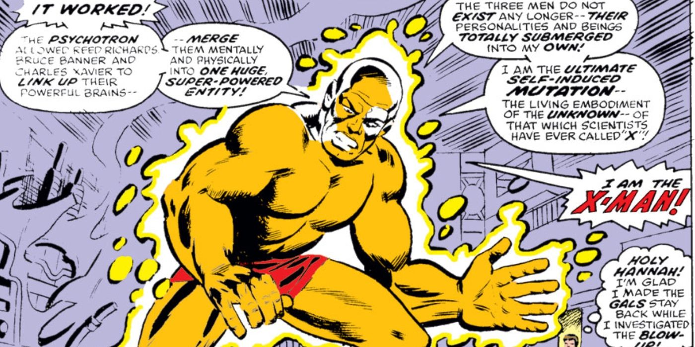 #2: What If The Hulk Had The Brain of Bruce Banner. Ok this one starts off just fine and logical and what the fuck why is Professor X, Mr Fantastic and Bruce Banner combining into some giant gold man baby?